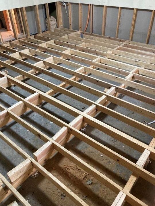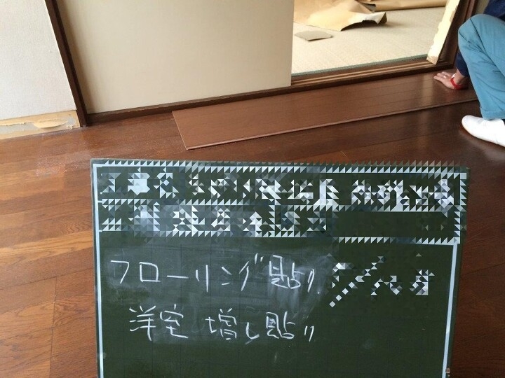 写真は既存のフローリングの上に重ね張りしているところ。