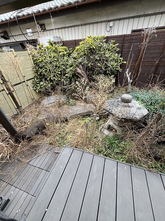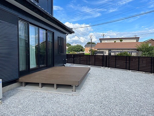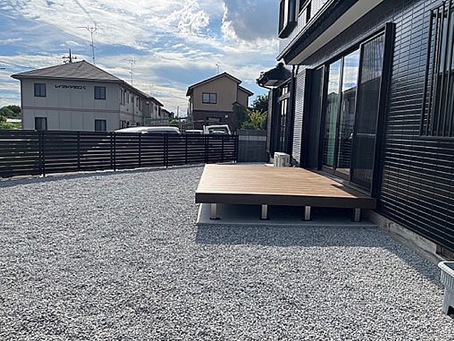 写真は完工後の写真です。今回は地面の掘り起こしから始まり、砂利を敷きウッドデッキの設置まで作業をさせて頂きました。